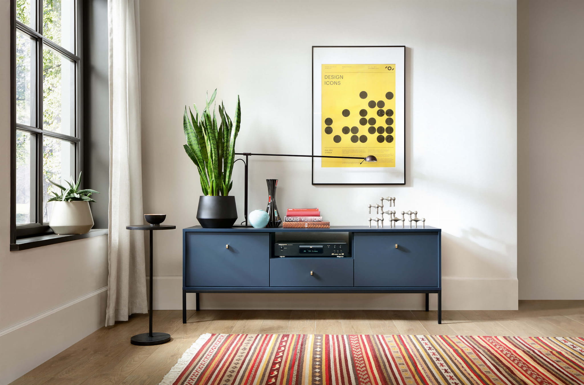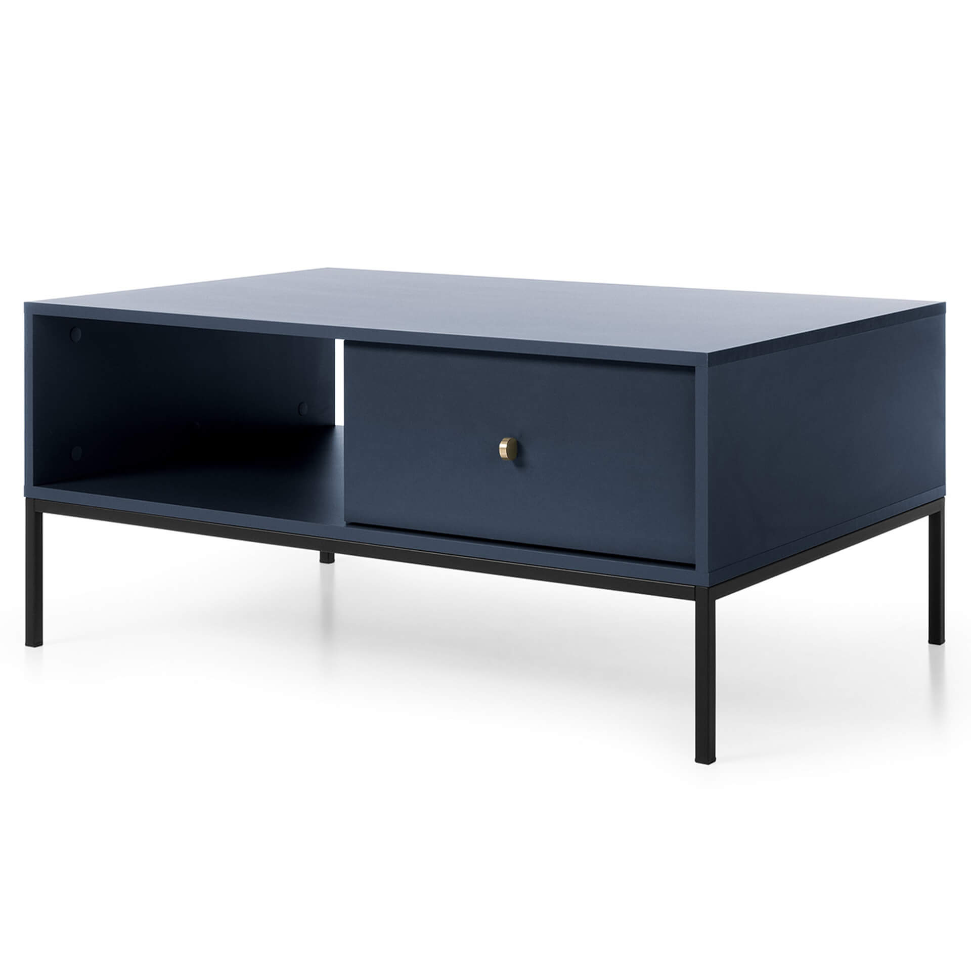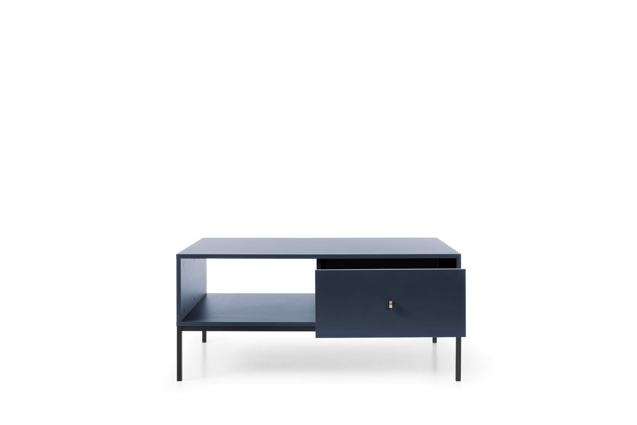 Złote uchwyty wyjątkowo komponują się z głębokim granatem. Tak luksusowy duet zwieńcza elegancki charakter mebla, a praktyczna szufladka to świetne rozwiązanie, ponieważ pomaga zachować porządek w salonie.