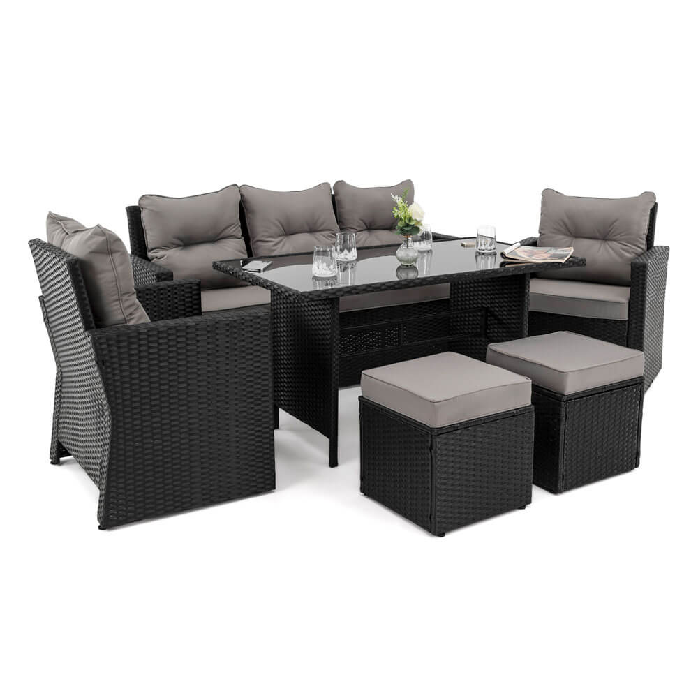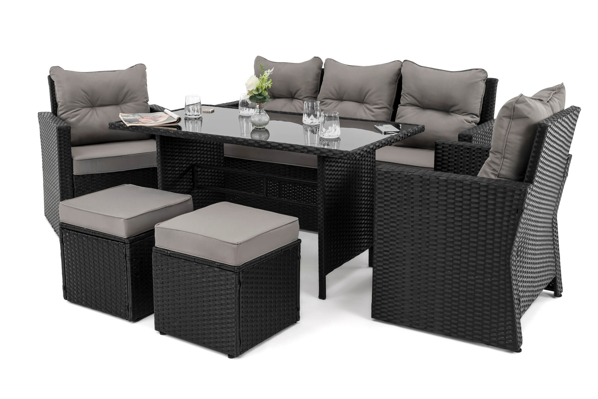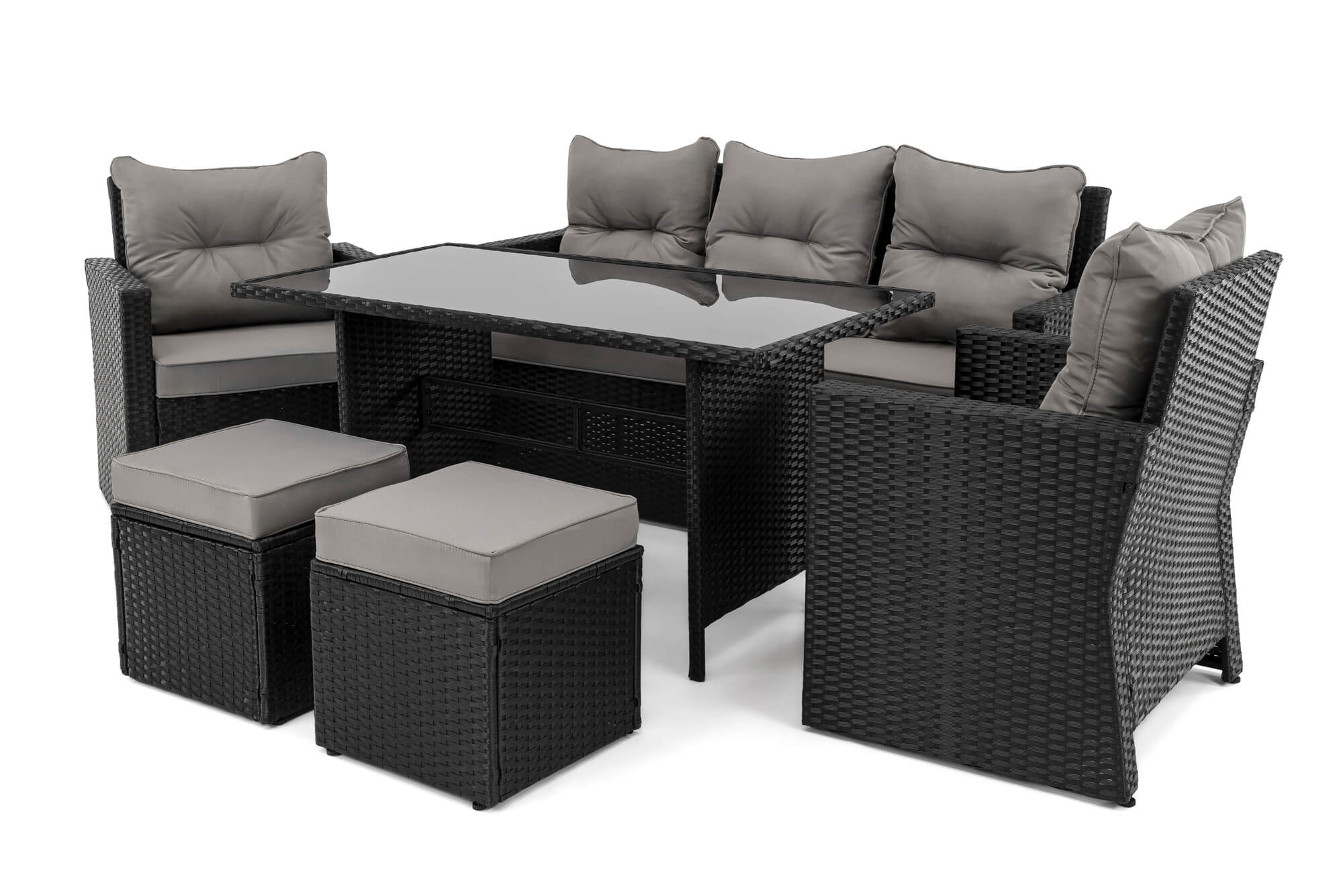 Nasz zestaw mebli ogrodowych dla 7 osób składa się z sofy, dwóch foteli, dwóch puf i stołu. Wszystkie te elementy można dowolnie aranżować i przenosić w inne miejsce w razie potrzeby. Wykonane z technorattanu w kolorze klasycznej czerni, z kontrastowymi jasnymi poduchami, prezentują się niezwykle elegancko, a przy tym są trwałe i wytrzymałe.